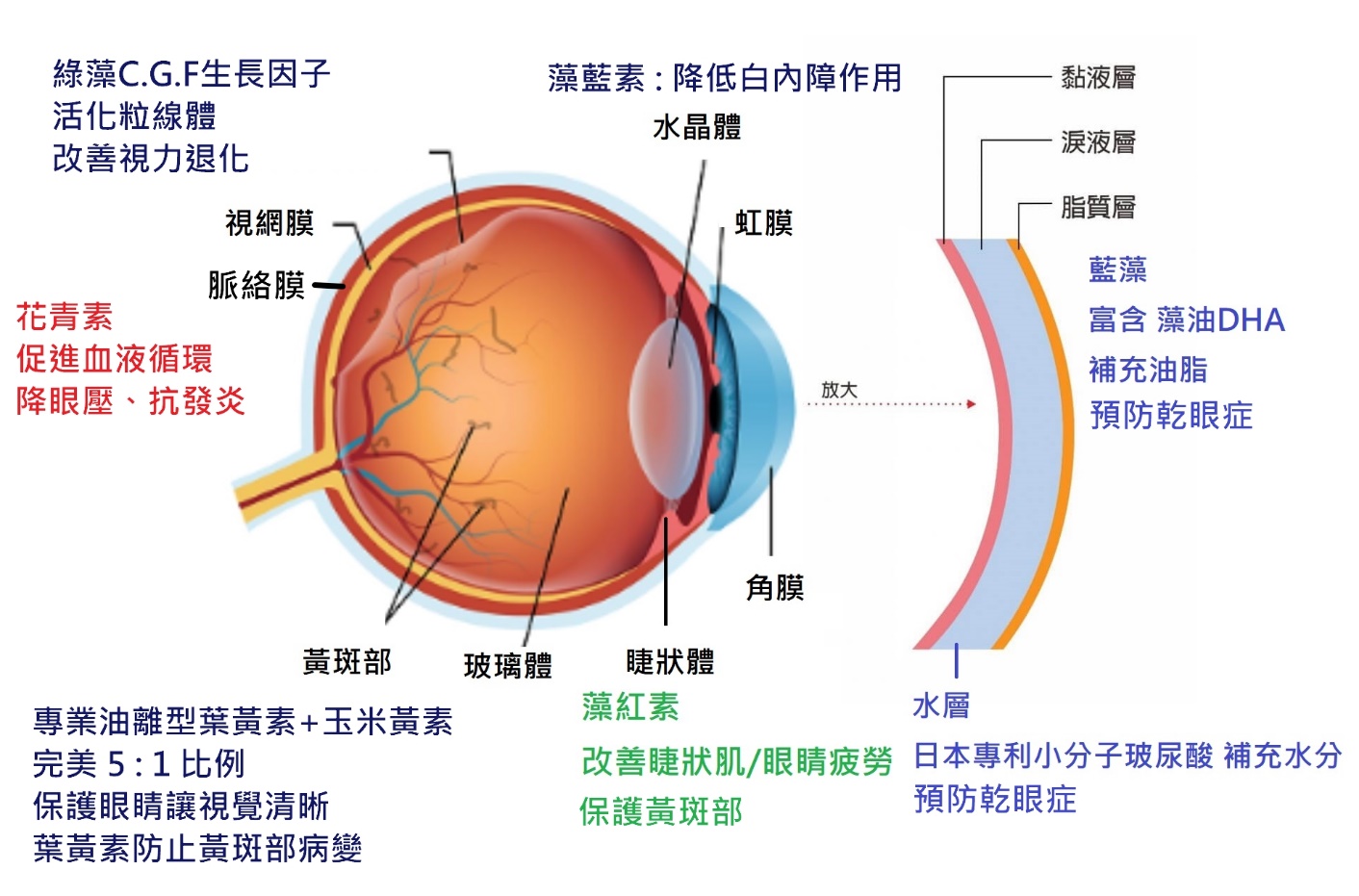 功用:豐富的藻油 DHA,滋潤補充角膜(脂質層)油脂。
